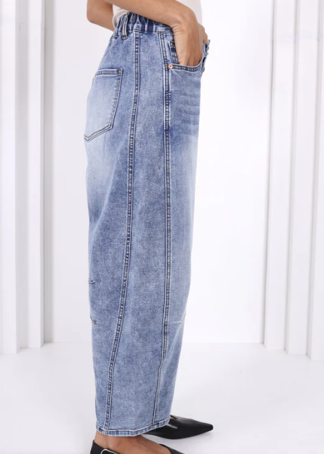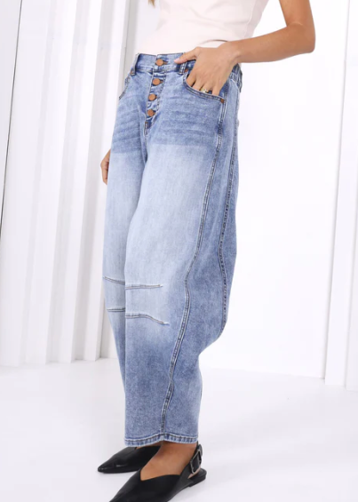 The Carson Barrel-Leg Jeans bring a fresh, modern twist to a classic Western vibe. Designed with a fitted waist, a flared mid-leg, and a tapered bottom, they create that signature barrel silhouette—effortless, bold, and just a little bit cowboy-cool.