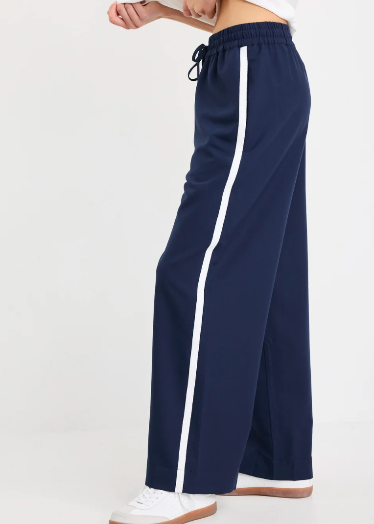 The Townie Blue pant is designed with a high-rise fit, elastic waistband, and pull-on ease, these plain navy trousers are a sleek staple that work across seasons. The soft stretch blend keeps them comfortable while the wide-leg cut makes them perfect for high-low styling from sneakers to heels.