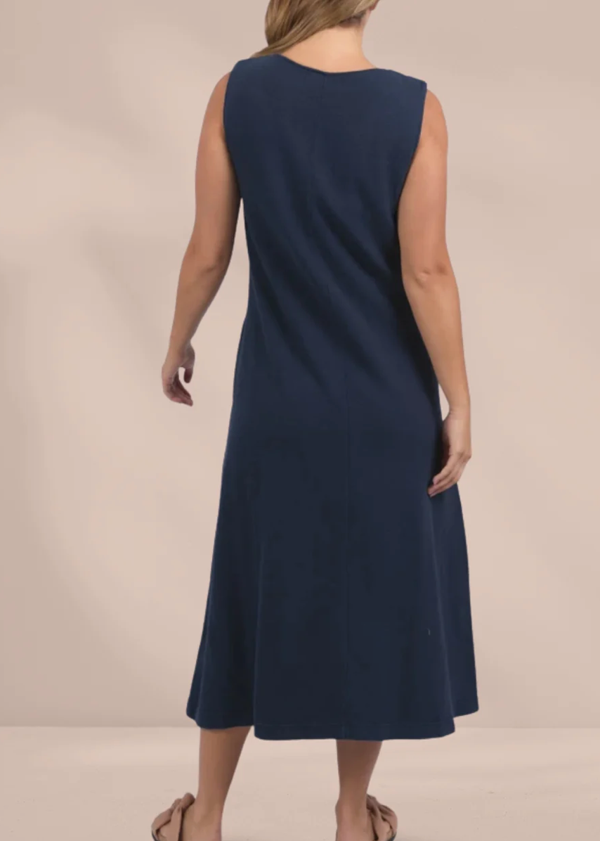 If you’re looking for a dress that’s as effortless as it is comfortable, the Aspen Dress in Navy by Foxwood is your go-to. Crafted from soft jersey with clean, uncomplicated lines, it features bra-friendly straps and a sleeveless midi silhouette you’ll reach for again and again. The flattering V-neckline adds a feminine touch, while the relaxed fit drapes beautifully—perfect for warm days when comfort matters just as much as looking put-together.
