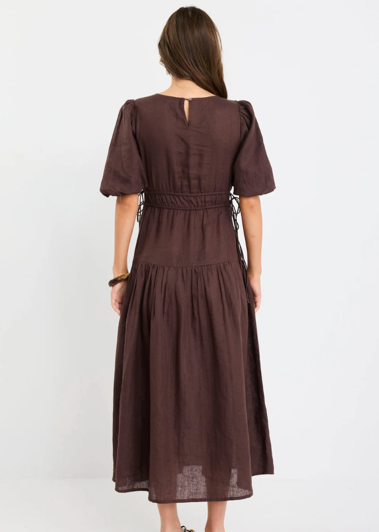 Glory Chocolate Linen Puff Sleeve Midi Dress | Abbey Road Kaikoura