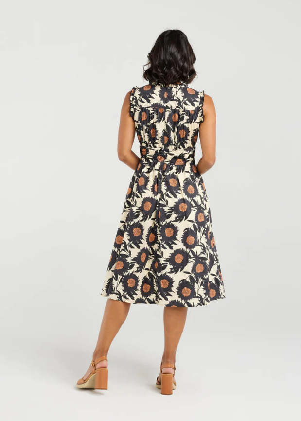 Romantic yet tailored, this sleeveless dress features a beautifully fitted bodice and a nipped-in waist that flows into a softly structured A-line skirt. Delicate frill detailing at the neckline and armholes adds a feminine touch, while piping detail  at the waist highlights the more fitted silhouette. Perfect for this summer BBQ's with sandals or with a heel for a summer wedding.