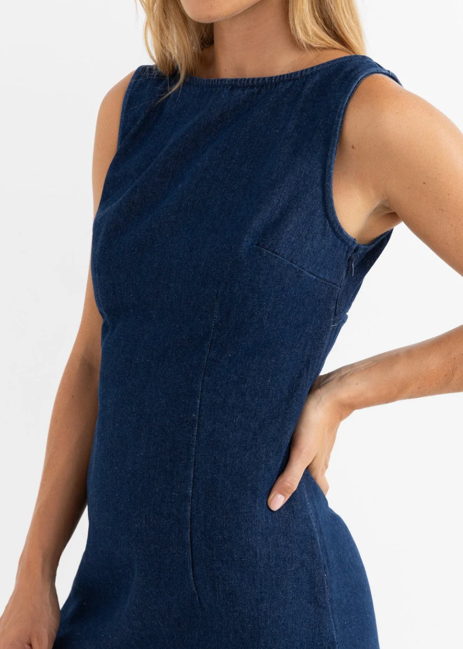 Effortlessly chic, the Kendrick Denim Mini Dress is crafted from 100% cotton ridged denim for a structured yet comfortable fit. Designed with a high front neckline and a low, open back accented by a self-tie detail, this dress perfectly balances sophistication and allure.