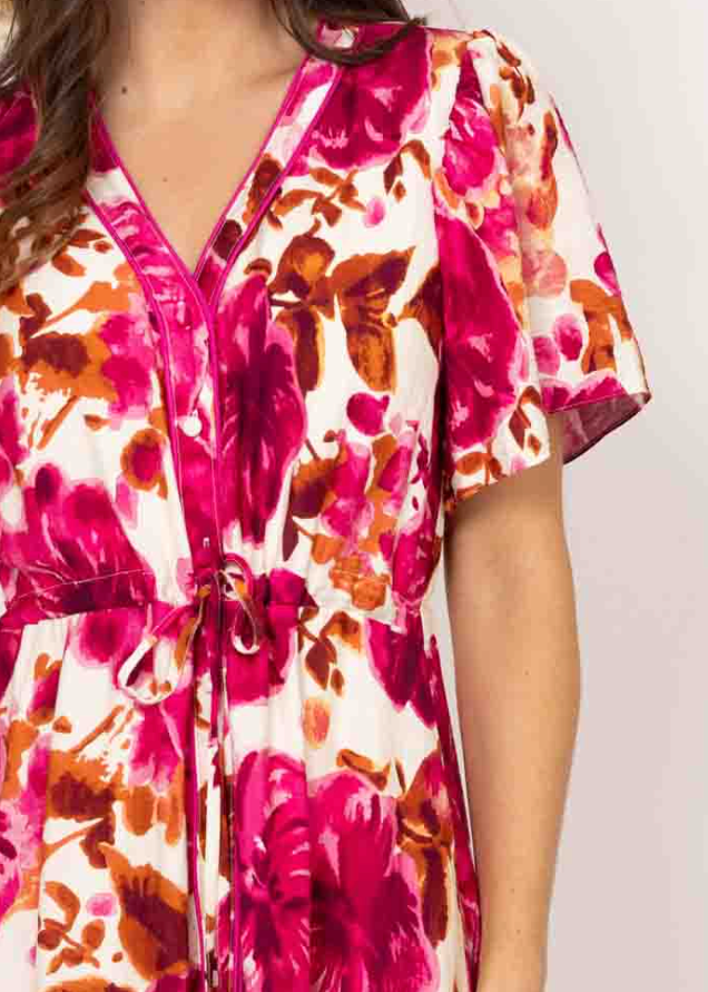 A gorgeous statement piece in bright pink and rust tones, the Lexi Maxi Floral Dress captures effortless femininity with a modern twist. Designed in a standard fit, it features a flattering V-neckline, short sleeves, and a waist cord tie that allows for a customizable silhouette. Tiered detailing adds graceful movement, while the lined finish ensures comfort and coverage. Perfect for sunny days, garden parties, or relaxed evenings out.