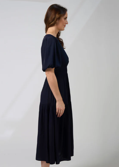 This midi-length tiered dress features an elasticated row detail through the waistline, creating a flattering and comfortable fit. Designed with full-length sleeves finished with a soft bubble hem and gentle gathering at the sleeve head, it offers a touch of volume and elegance. A back neck keyhole split with a gold logo button fastening adds a refined finishing detail. Crafted from a smooth and lightweight blend of 65% viscose and 35% polyester, this dress is easy to wear and perfect for both day and evening occasions.