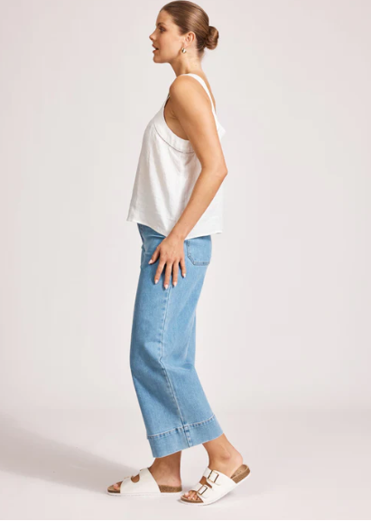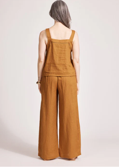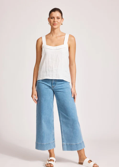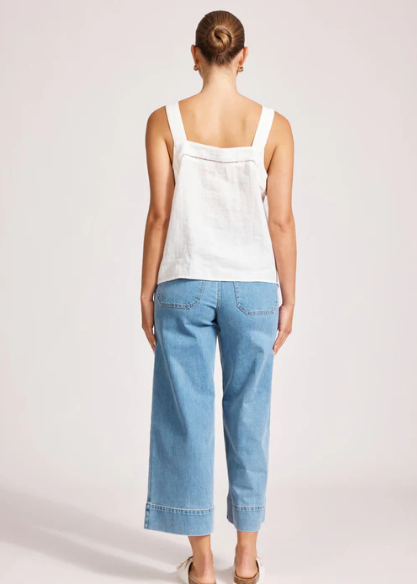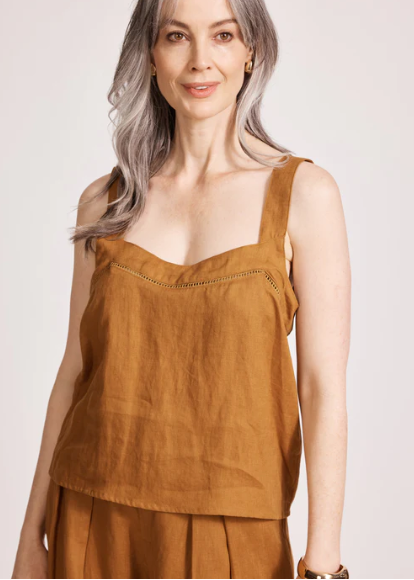 A warm-weather staple with timeless appeal. Made from 100% linen for naturally breathable comfort, this top features a square neckline, wide straps, and delicate ladder-lace detailing. The structured, slightly cropped silhouette pairs effortlessly with coordinating linen bottoms or your favourite denim.
