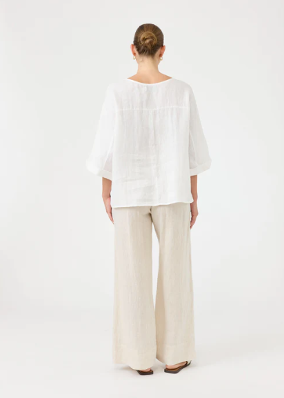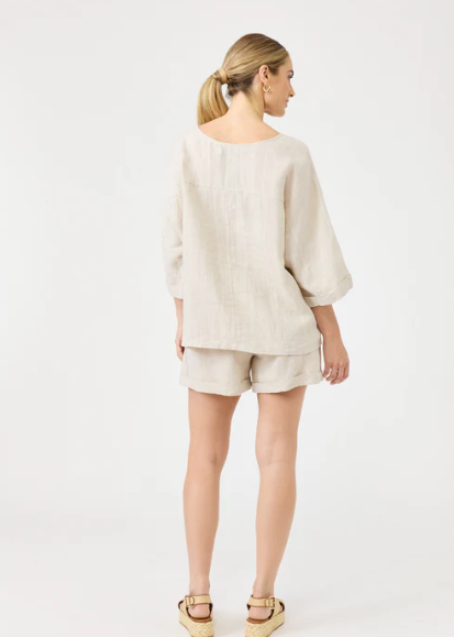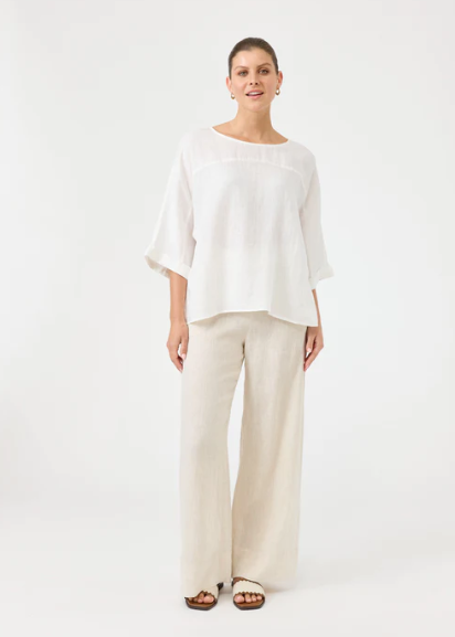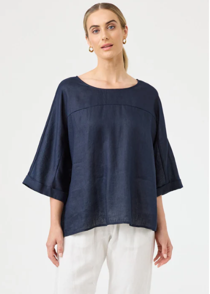 This linen top features a classic crew neckline, wide 3/4 cuffed sleeves, and subtle seam detailing above the chest. Crafted from 100% linen, it offers breathable comfort for effortless everyday wear.