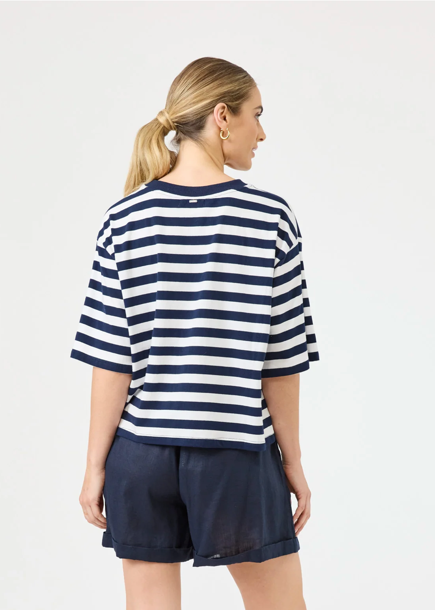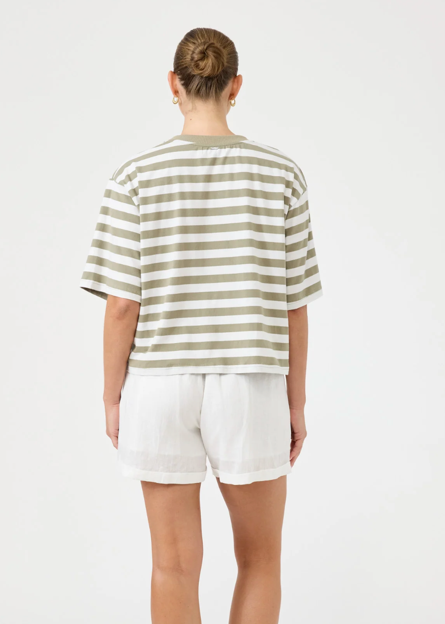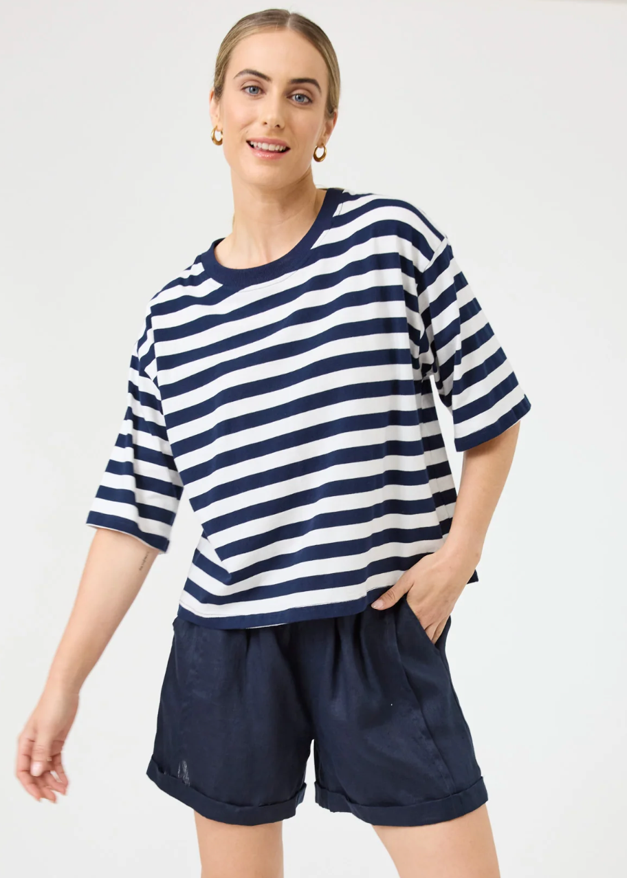 A fresh wardrobe staple with timeless appeal. Crafted from a breathable, lightweight cotton blend with a touch of stretch for ease and comfort. Featuring classic stripes, a crew neckline, and elbow-length sleeves, it’s designed in a boxy silhouette for a modern, flattering fit. Pair it with shorts, denim, or linen pants for effortless everyday style.