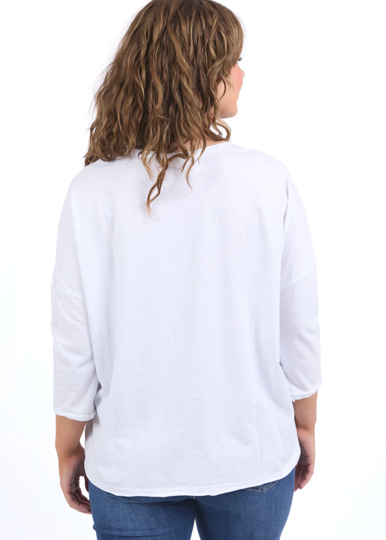 Move freely and feel great in this oversized long-sleeve tee. Designed with Elm’s signature raw-edge details on the neckline and 3/4 sleeves, it offers effortless style and everyday comfort. Made from soft cotton slub jersey, it’s the perfect throw-on piece for relaxed, easygoing wear.