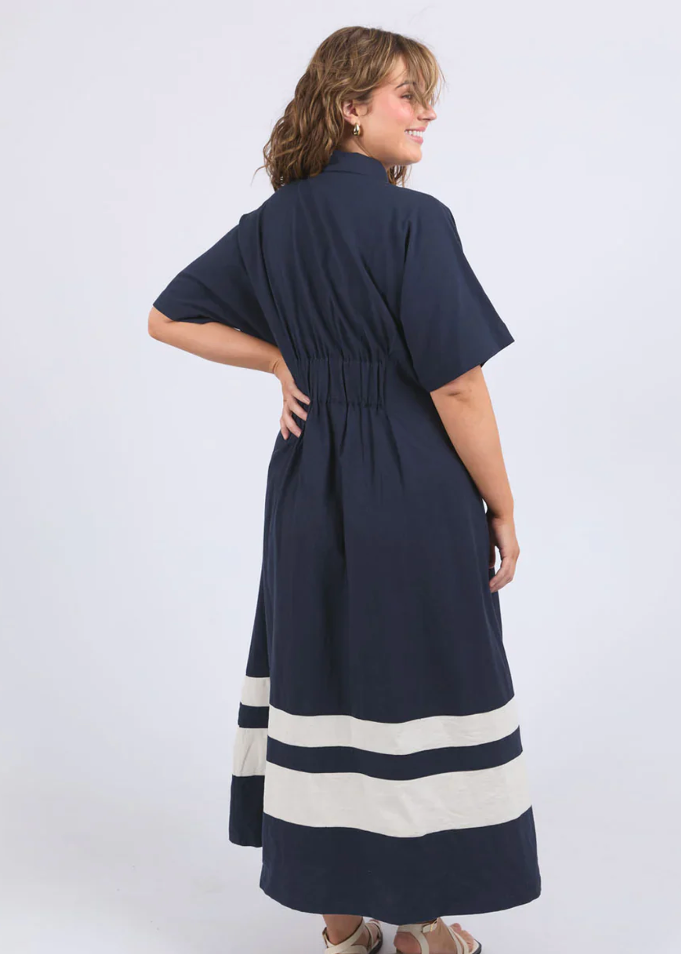 Say hello to effortless summer style with the Scarlet Midi Dress in Navy Stripe by Elm. Designed with a full button front, short sleeves, and statement pleat detailing at the waist, this midi shirt dress offers just the right balance of structure and ease. Bold contrast stripes along the hem add a playful, modern edge, while the light, breezy fabric keeps you comfortable all day.