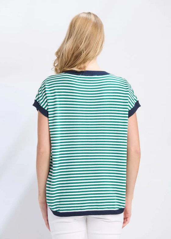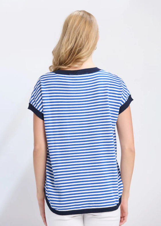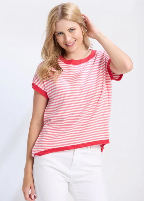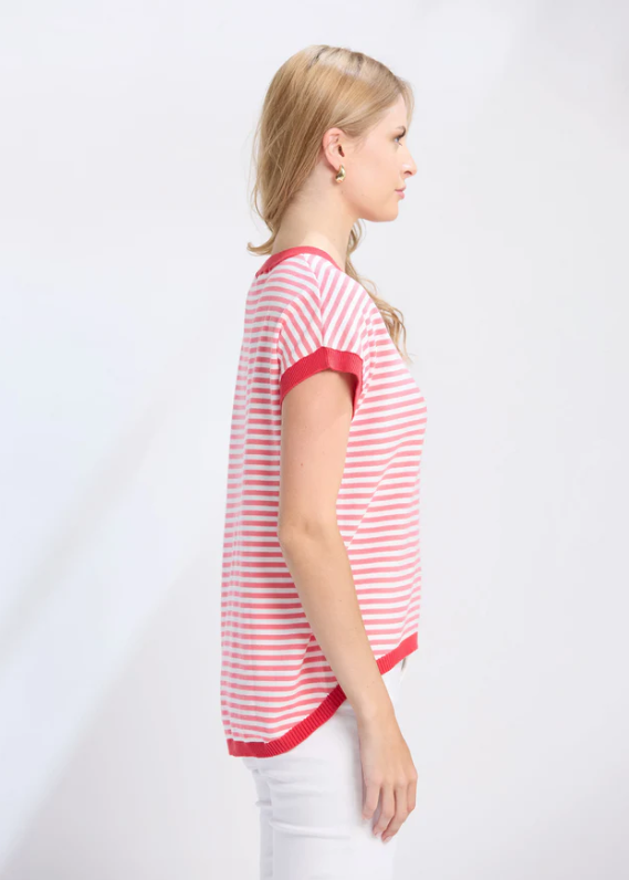 Crafted from 100% cotton, this lightweight striped knit offers breathable comfort and effortless style. Designed with contrast colour trims for a pop of detail, it features a classic crew neckline, dropped cap sleeves, and a hi-lo hemline that adds a modern, relaxed finish. Perfect for layering or wearing on its own, this piece brings a fresh, easygoing touch to your everyday look.